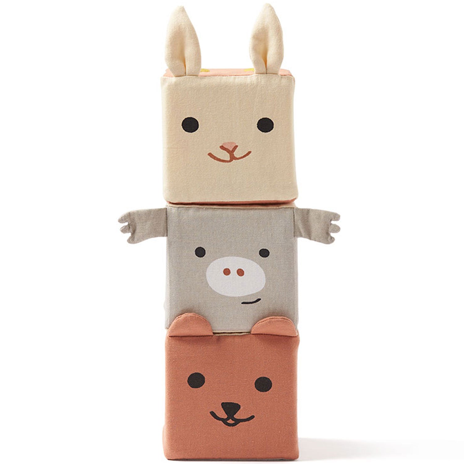 3-pack med tre stora mjuka klossar i djurmotiv i kraftig ekologisk bomullskanvas