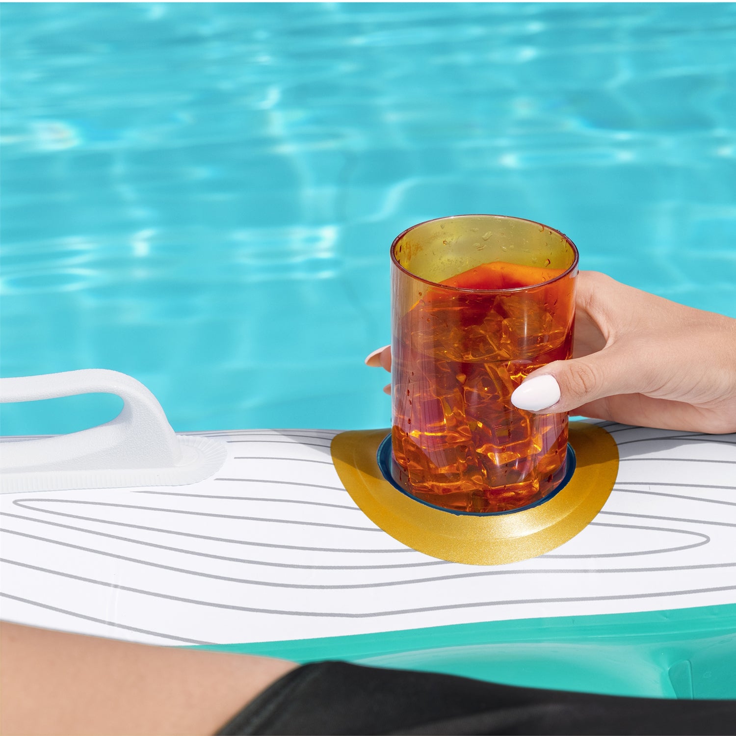Denna stiliga lounge har ett bekvämt nackstöd, en mugghållare för din favoritdryck och en inbyggd förvaringsyta perfekt för din telefon, bärbara högtalare eller andra värdesaker. Förvaringsytan fungerar också som en kylare, så släng i lite is i facket och dina drycker kommer att hålla sig svala medan du glider omkring. De kraftiga handtagen gör det enkelt att hoppa i vattnet för ett dopp och dra dig tillbaka på flotten med lätthet.