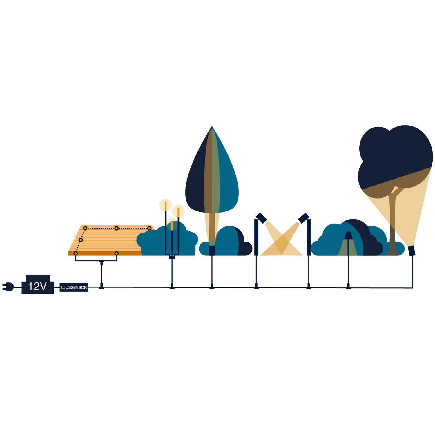 Ett flexibelt och prisvärt 12-voltsystem (trygg svagström) för din trädgård, som du själv enkelt installerar och senare kan bygga vidare på, upp till 50 meter, om du vill. Lamporna har varmt ljus och skandinavisk design, anpassade för vårt klimat här uppe i norr.