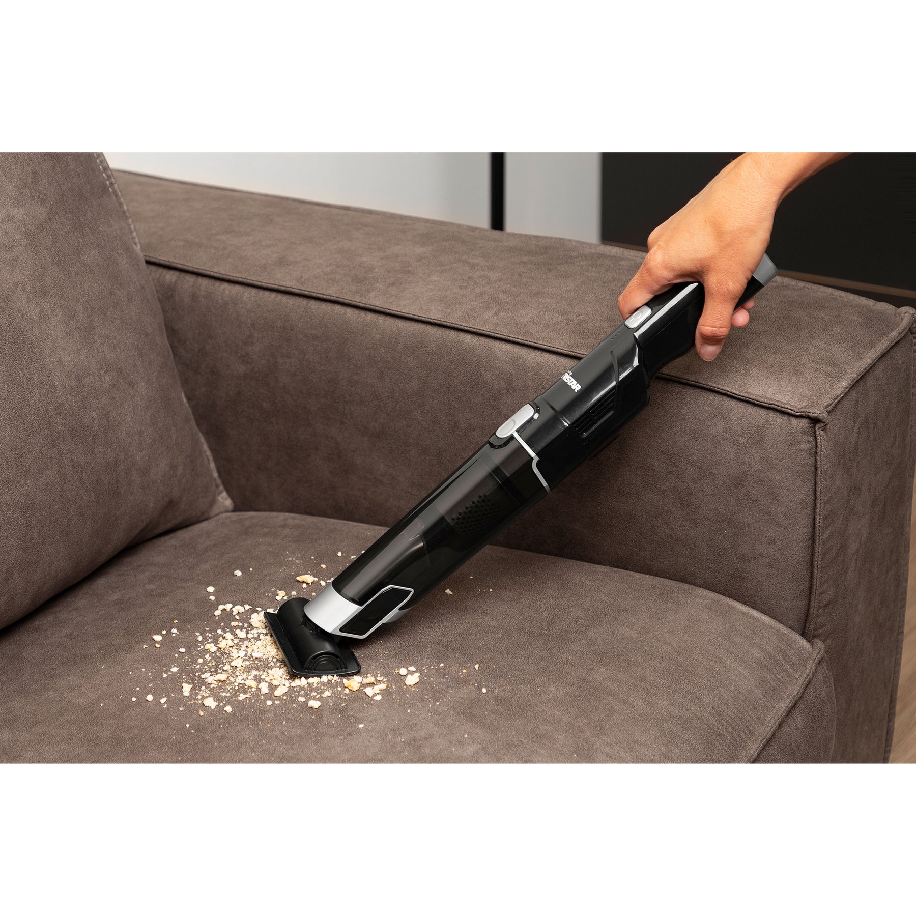 Kraftfull dammsugare med handtag i slimmat utförande. Den borstlösa motorn ger en hög sugkraft på 12 kPa.